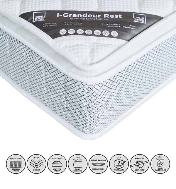 Experience superior comfort with this Grandeur Rest pillow top spring mattress, designed for a restful sleep. This mattress features a medium firm comfort level and is encased in foam for enhanced support and durability. The knitted fabric cover provides a soft, non-allergenic surface, ensuring a hygienic sleep environment. Enjoy long-lasting quality with the seven-year warranty, making this an excellent investment for your bedroom.