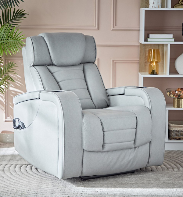 دللي نفسك بأقصى درجات الرفاهية باقتناء كرسي الاسترخاء الرائع هذا. منجد بالجلد الصناعي الكلاسيكي بتشطيب فاخر. يضمن حشو المقعد الإسفنجي والنوابض ساعات من الراحة، بينما توفر مساند الأذرع المنحدرة ومساحة تخزين الأكواب وتدليك الوسادة الهوائية ومسند القدمين المتكئ المزيد من الراحة، ليصبح هذا الكرسي المتين مكانك المفضل للاسترخاء.