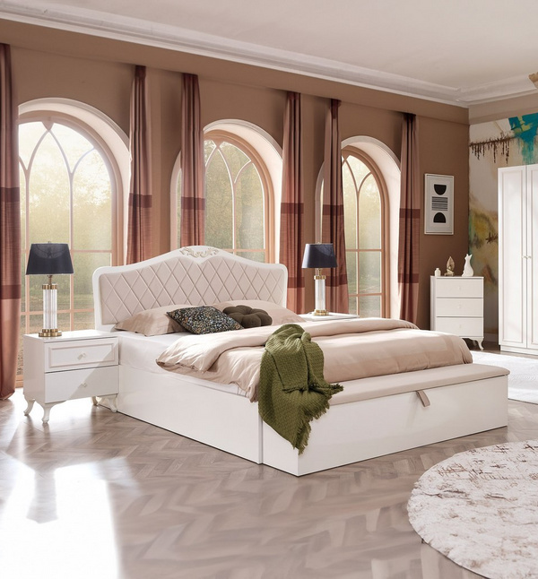 جدّدي ديكور منزلك باقتناء هذا الطقم الفاخر لغرفة النوم. يتكون من سرير وطاولتي سرير جانبيتين وطاولة تزيين مع مقعد ومرآة، ويتميّز بتصميم راقي للغاية يعكس ذوقك الفريد، كما أنه مصنوع من خامات عالية الجودة ومتينة، تضمن لكِ الاستدامة والتحمل، كما أنه سهل العناية والتنظيف..